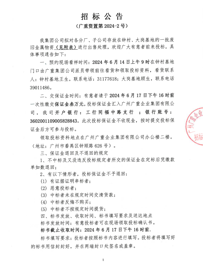 废旧金属物资处置(必一体育平台资置2024-2号)